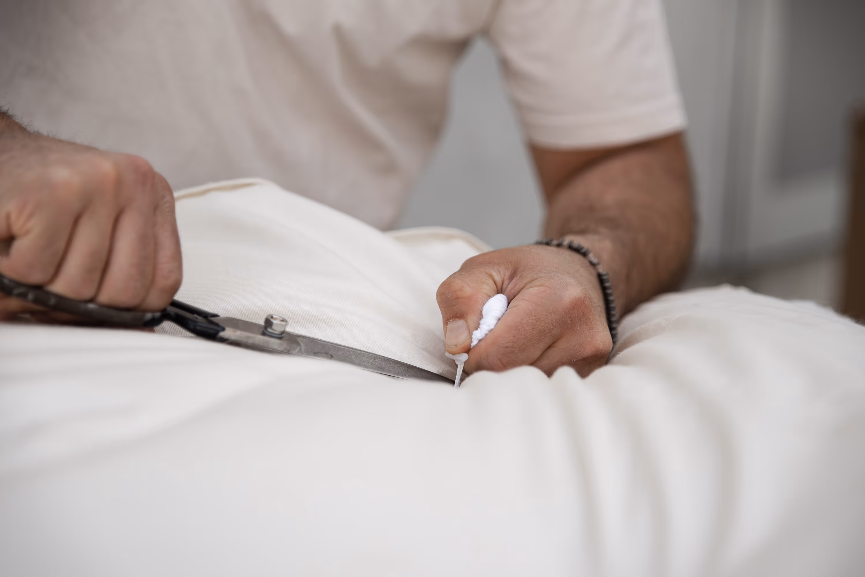 Quello che da stabilità ai diversi strati e al molleggio sono due lavorazioni manuali, nello specifico la puntatura perimetrale della fascia attraverso un filo che viene ancorato al molleggio e una puntatura a fiocco, sopra e sotto, che tiene ferma l’imbottitura.